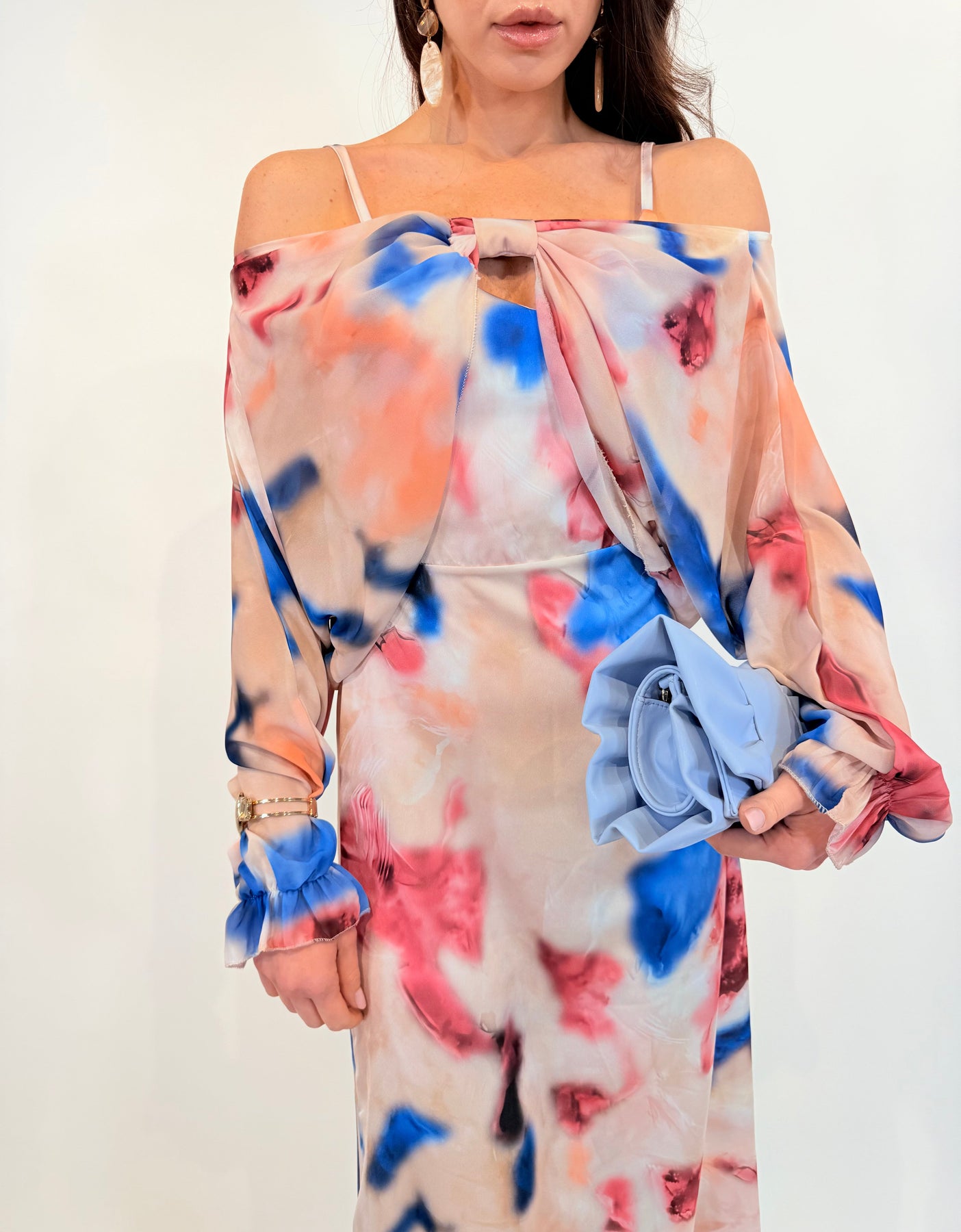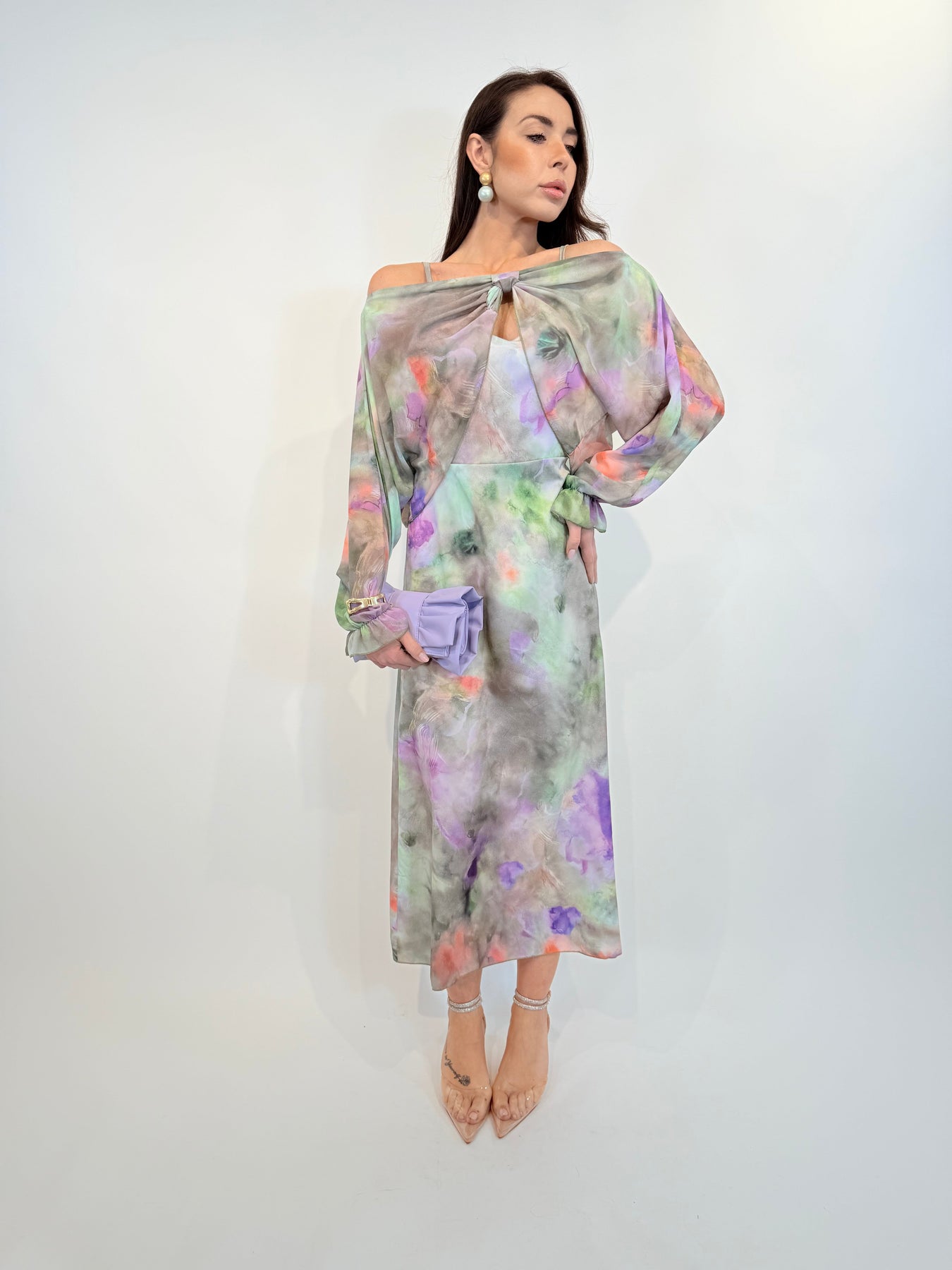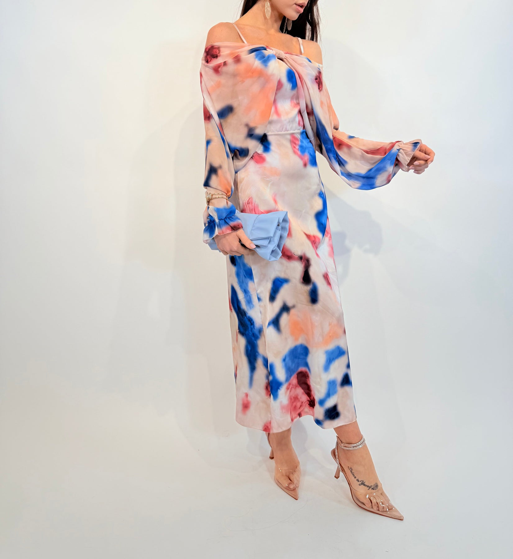 • Elegant design: Long flowing dress with a vibrant floral print.