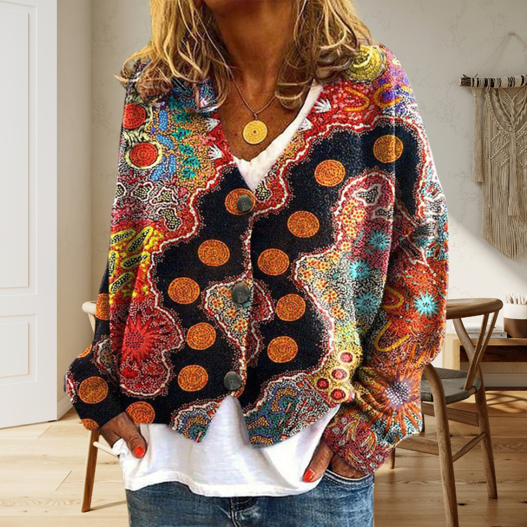 The Maya Bohemian Cardigan combines striking ethnic patterns with maximum comfort. Its colourful design and loose fit make it the perfect piece to express your unique style, whether casual or dressy. Effortlessly add a boho touch to your wardrobe with this versatile sweater.